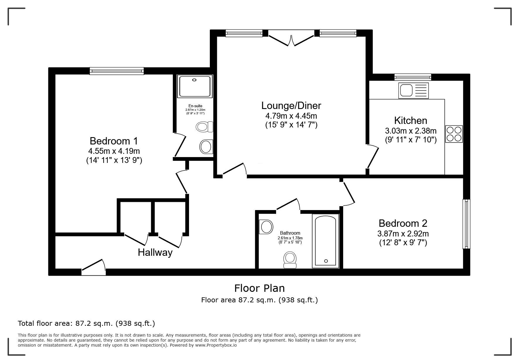 Step inside to discover a generously sized lounge/dining room with a charming Juliet balcony. The modern fitted kitchen features integrated appliances and ample storage, while two well-proportioned double bedrooms provide comfortable living, including a private ensuite to the main bedroom. A spacious family bathroom completes the accommodation.