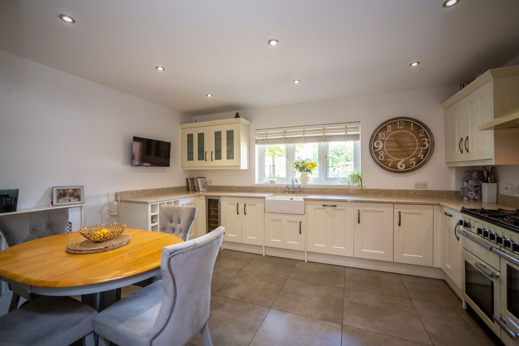 The ground floor comprises a welcoming entrance hall, a stylish cloakroom/utility room, a sleek modern kitchen/breakfast room featuring a Range Master cooker and wine cooler, and a separate bright dining room with doors opening onto the private, mature rear garden.